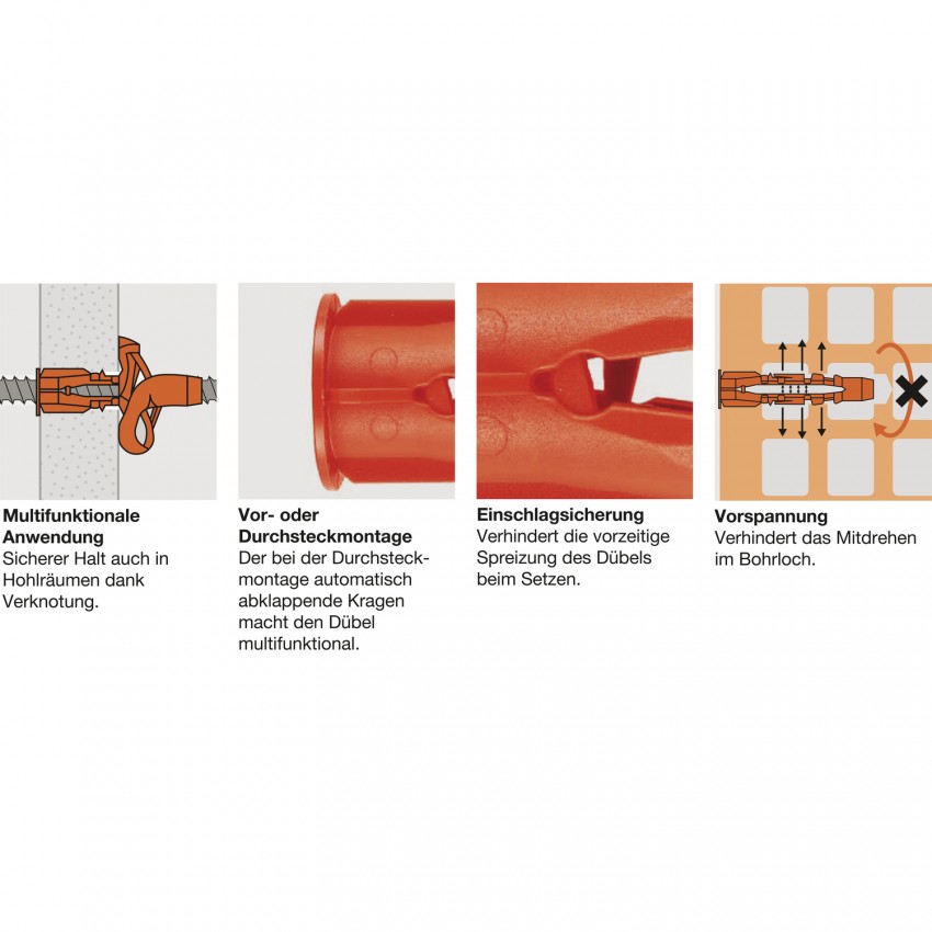 Stingri notur spraudni caurumā pret griešanos; garantē tūlītēju saķeri, kad spraudnis izplešas