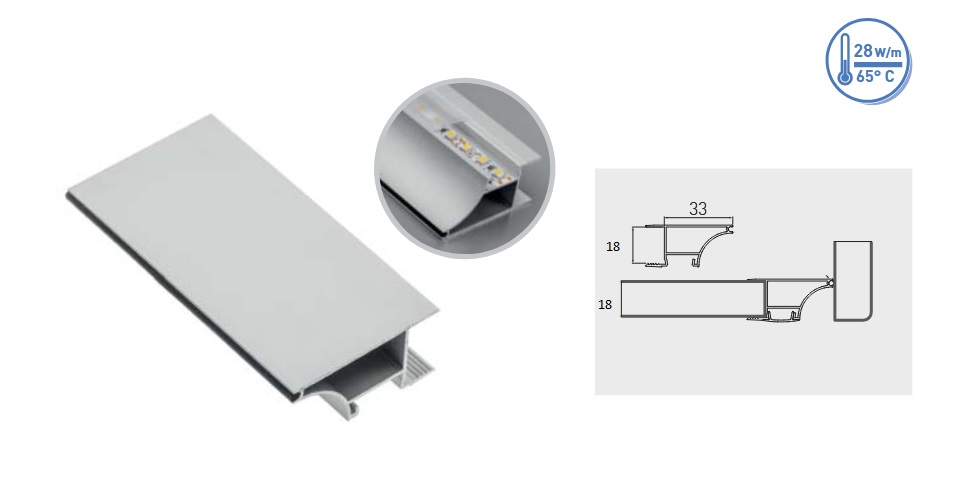 Profils LED lentām, uzliekams uz 18mm materiāla, alumīnijs, garums 2m. Papildus ir nepieciešams ievietot blīvējumu.