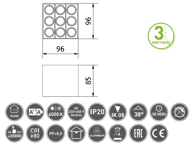 Paredzēta iekštelpām - IP20. AC 220-240V, 4000K. Krāsas - melna un balta.