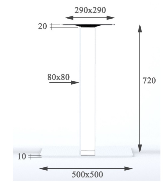 Pamatne 500x500 mm, augstums 720 mm, svars 18 kg, rekomend. maksimālais virsmas diametrs 800x800 mm.