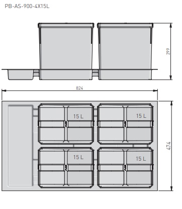 Atkritumu konteineru komplekts AXISPACE 900mm korpusam 4X15L