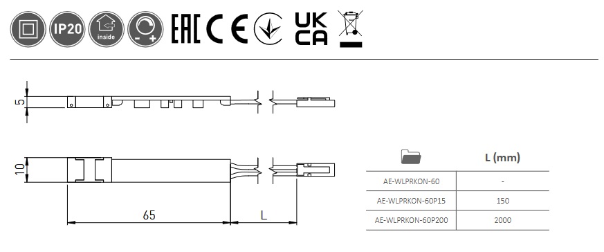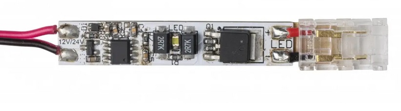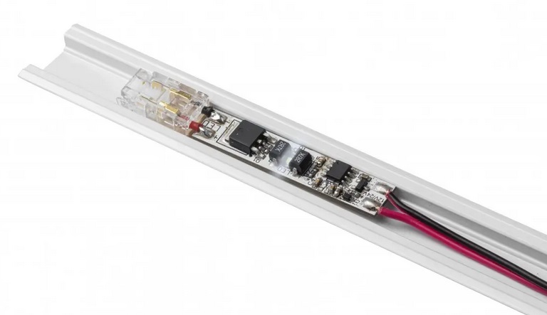 Bezkontakta slēdzis montāžai alumīnija profila iekšienē, no vienas puses noslēgts ar COB savienotāju, kas ļauj ātri piestiprināt COB lenti pie slēdža, un no otras ar 15cm garu mini pastiprinātāja kabeli.