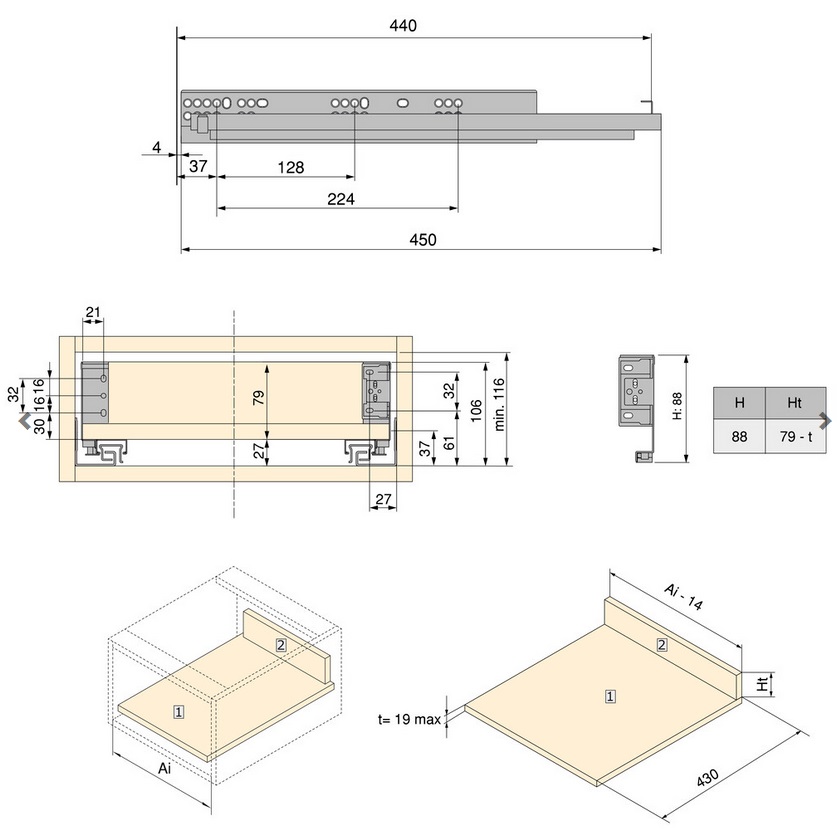 Tās augstums ir 88 mm, elegants dizains, paredzēts atvilktnēm ar 440 mm dziļumu, piedāvājot plašu iekšējo telpu un modernu apdari.