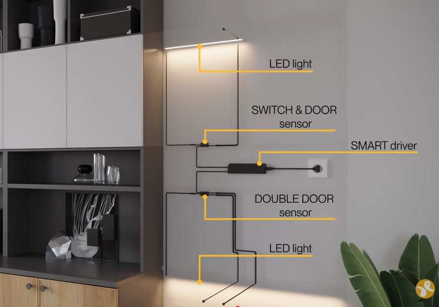 Tas tiek aktivizēts, ja tā 6 cm noteikšanas diapazons tiek traucēts, atverot vai aizverot korpusa durvis. Pateicoties dubultajai lēcai, tas ir ideāli piemērots uzstādīšanai viencauruma korpusos ar divām veramām durvīm, ieslēdzot gaismekli neatkarīgi no tā, kuras durvis ir atvērtas, un uzturot gaismekli ieslēgtu, līdz abas durvis ir aizvērtas. To var savienot ar viedo pārveidotāju, izmantojot vadības portu, ļaujot vienlaikus ieslēgt un izslēgt visus pārveidotājam pievienotos gaismekļus ar vienu sensoru. Šāda veida instalācijā maksimālo jaudu iestata pārveidotājs.