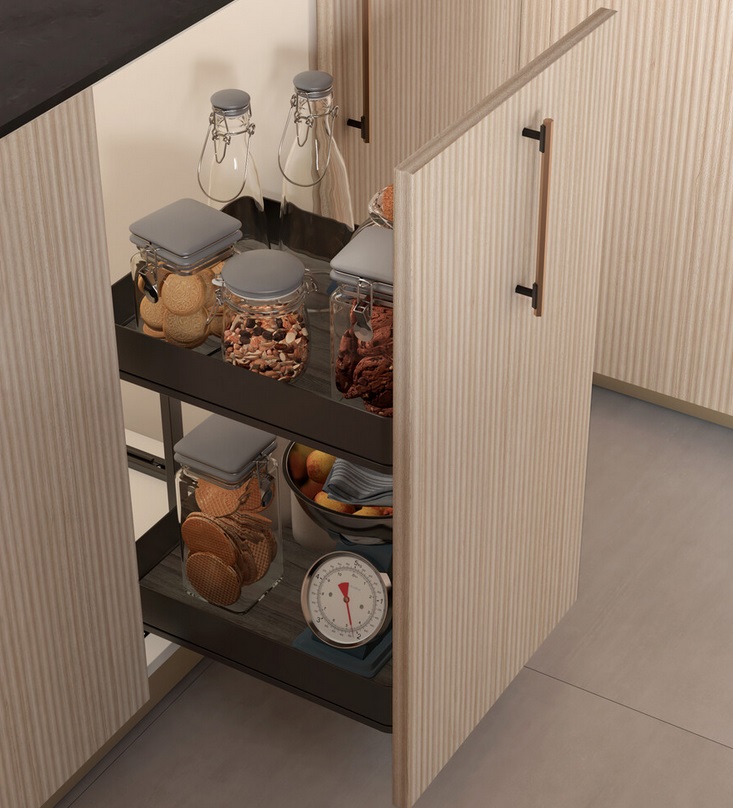 Izvelkams bloks ar 2 groziem, kas paredzēts, lai maksimāli palielinātu uzglabāšanas iespējas un maksimāli izmantotu vietu virtuves skapīšos – funkcionāls un estētiski izsmalcināts risinājums.