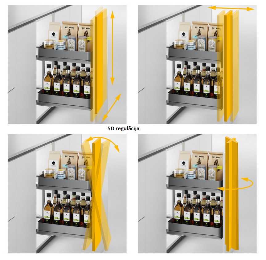5 virzienu durvju regulēšana: ±2,5 mm augstumā, ±2 mm horizontāli un līdz +3 mm dziļumā – nodrošinot perfektu integrāciju ar skapi.