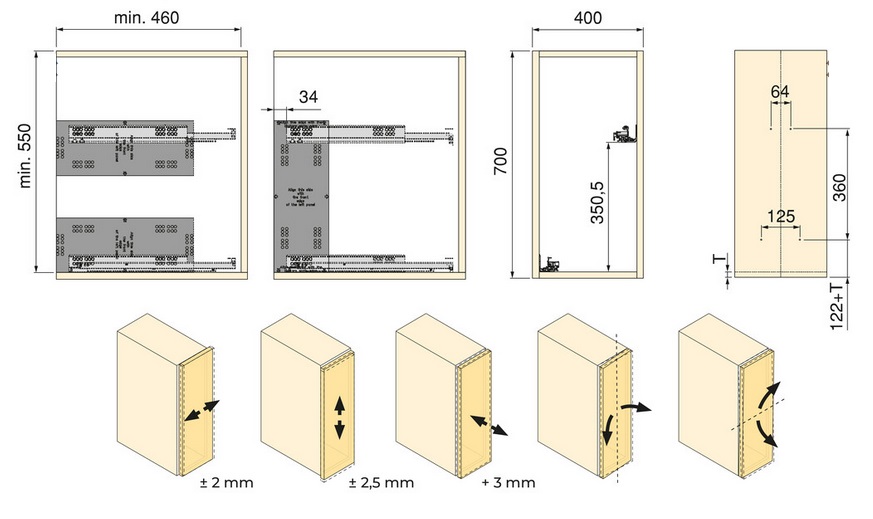 Paredzēts 400 mm platiem, 700 mm augstiem korpusiem ar minimālo dziļumu 460 mm. Piemērots paneļiem ar biezumu 16, 18 vai 19 mm.
