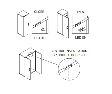 Bezvadu, kompakts slēdzis, kas automātiski aktivizē apgaismojumu, atverot durvis. Ideāli piemērots virtuves, vannas istabas, ģērbtuves vai guļamistabas mēbelēm, tas nodrošina lietošanas komfortu bez redzamiem vadiem un sarežģītām instalācijām.